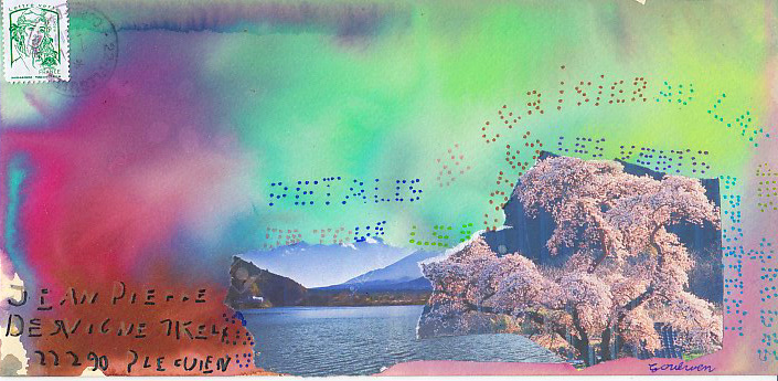 L'image ne rend pas vraiment hommage aux lumières de cette œuvre, à voir à l'expo " Art Postal et Poésie "